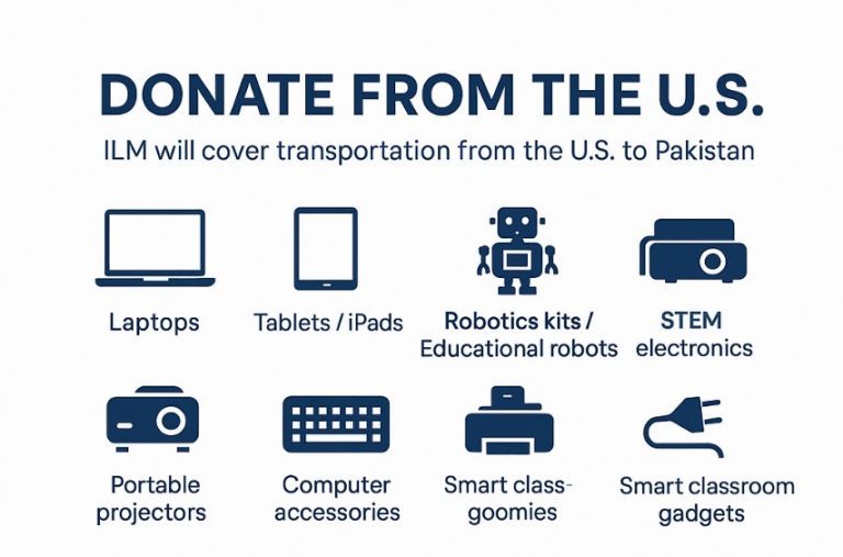 You may simply mail these items to the address shown. ILM will carefully review all donated items and arrange shipping for those that are suitable and worth transporting to Pakistan, ensuring they directly benefit children in need.