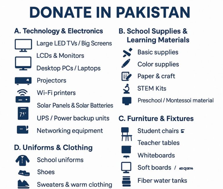 You can help transform education for children in Pakistan by donating items and materials that make a real difference. We accept a wide range of goods, including: